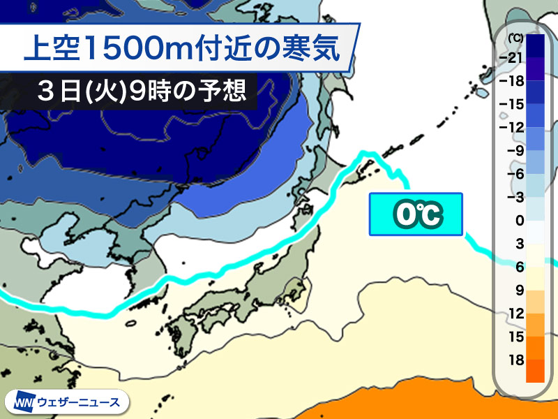 週明けの明日2日(月)の夜から3日(火)にかけて低気圧が日本海を北東に進み、低気圧から延びる前線が北海道や本州を通過します。前線の接近に伴って上空約1,500mの0℃線は北海道付近まで北上します。
