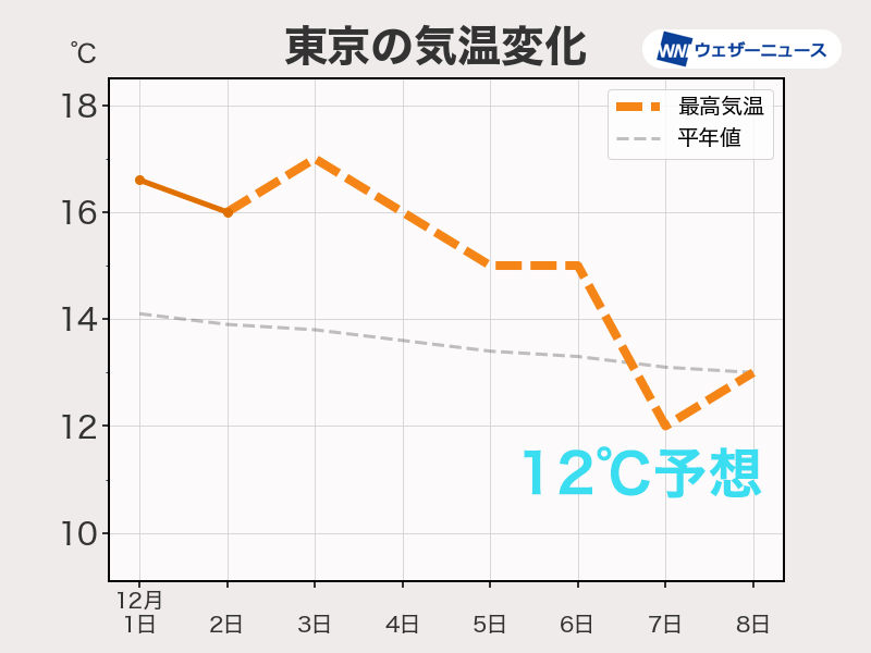 東京は12月中旬並みの12℃予想ですが、今日2日(月)の最高気温16.8℃は11月中旬並みの気温です。1週間足らずで体感的には1か月分季節が進むことになります。体感の変化で体調を崩さないようにお気をつけください。