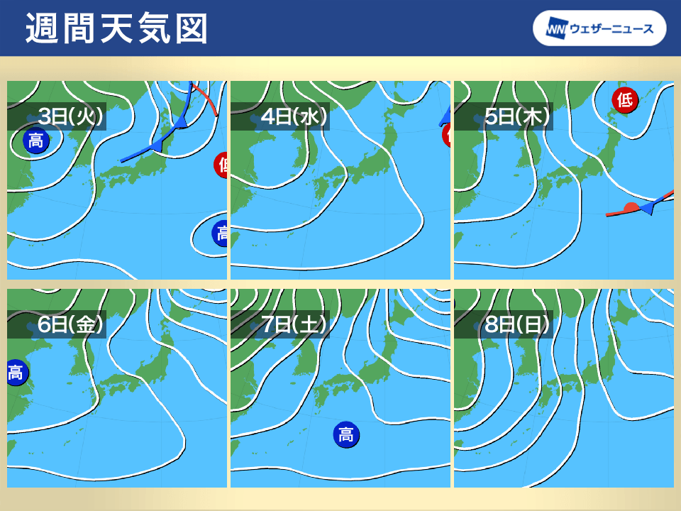 前線通過後は冬型の気圧配置が続き、日本海側を中心に雨や雪が降りやすくなる予想です。北海道の上空約1,500mには−6℃から−12℃という強い寒気が断続的に流れ込み、日本海側を中心に雪の降る日が多くなります。積雪の増加や大雪に注意が必要です。東北でも山沿いを中心に積雪が増すおそれがあります。