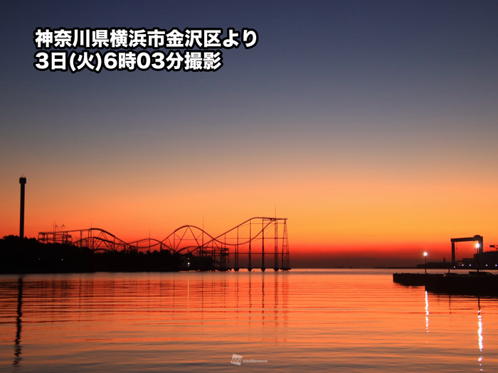 今朝の関東は高気圧圏内で、スッキリと晴れ渡った空となっていて、グラデーションに染まる空が見られたところが多くなりました。風も弱く、横浜市で撮影された写真では海が凪いでいる様子がわかります。内陸部では放射冷却が効いて冷え込み、霧の発生しているところもあります。視界不良に注意してください。