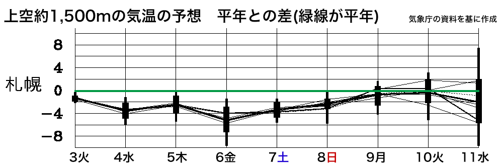 上空に寒気を伴った低気圧「寒冷渦」が偏西風の流れから切り離されて、シベリアからオホーツク海へゆっくりと移動し、寒冷渦の周囲の気圧の谷がたびたび日本付近を通過します。このため、日本付近に寒気の流れ込みやすい状況が9日(月)頃まで続くとみられます。
