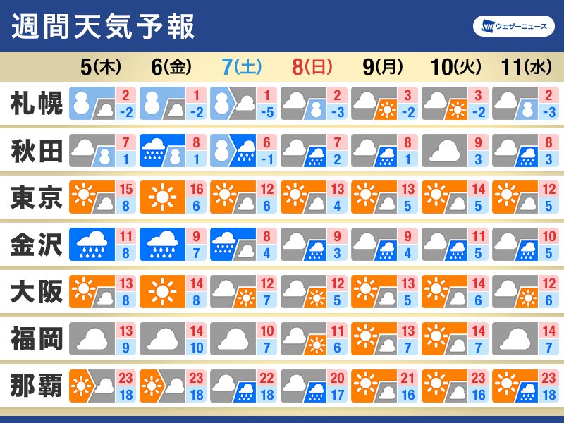 期間を通して日本海側の地域では雪や雨の日が多くなります。特に週末の7日(土)前後には一段と強い寒気が日本付近に南下し、北海道だけでなく東北や北陸でも雪の降る可能性があり、平地でも積雪となるおそれがあります。風も強まり荒れた天気となるおそれがあるため注意が必要です。
