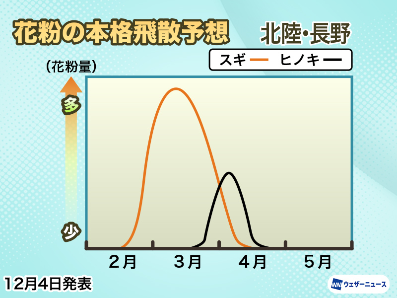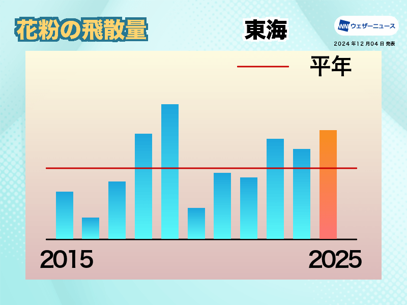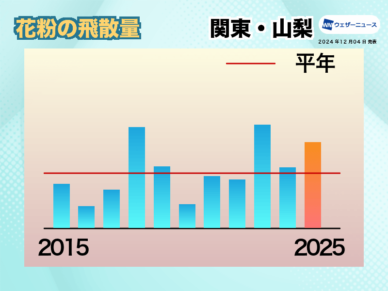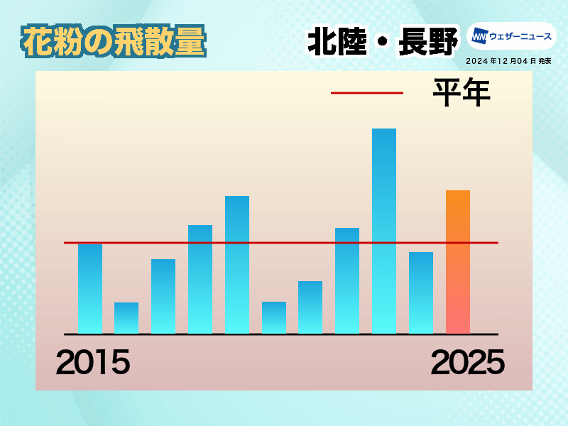 2025年春の花粉の飛散量は前年の142%、平年の155%となる予想で、特に北部を中心に前年の反動で飛散量が多くなる見込みです。北部では前年・平年を上回る飛散量となり、南部では前年並ではあるものの平年を上回る飛散量となる予想です。