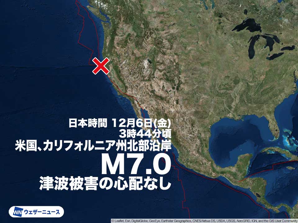 日本時間の12月6日(金)3時44分頃、海外で規模の大きな地震がありました。震源地は北米西部(米国、カリフォルニア州北部沿岸)で、地震の規模(マグニチュード)は7.0と推定されます。