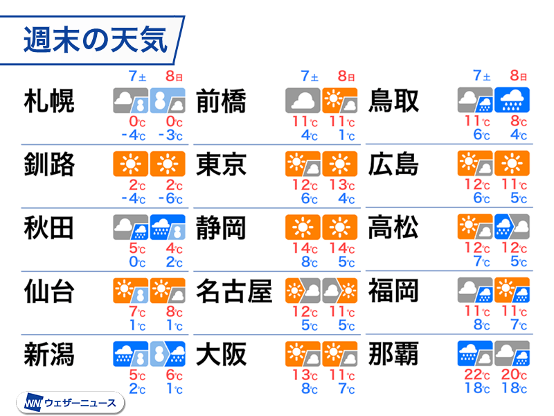 札幌市は土日ともに最高気温が0℃の予想で、東北の各地や北陸でも最高気温は10℃に届きません。関東から西は晴れる太平洋側も15℃未満で、8日(日)は大阪市や名古屋市で11℃の見込みです。