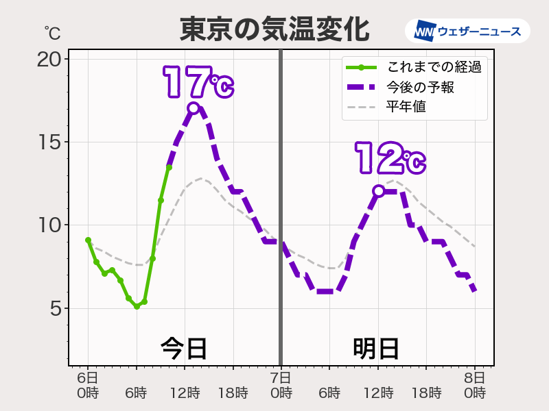 ただ、この時期らしからぬ陽気は今日まで。明日7日(土)は朝の最低気温こそ今朝と大きく変わらないものの、昼間は日差しが届いても気温が上がりません。最高気温は今日に比べて5℃ほど低い12℃の予想となっています。