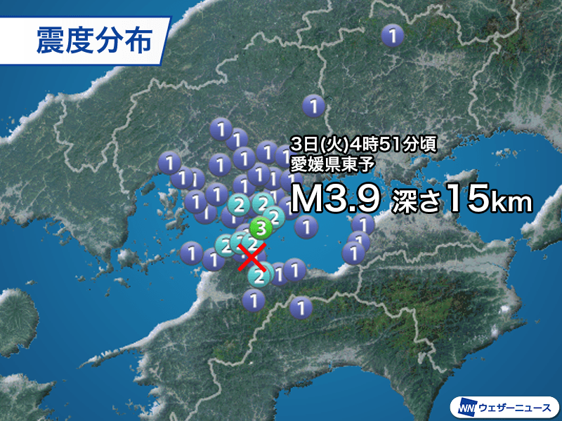 3日(火)4時51分頃、愛媛県東予を震源とするマグニチュード3.9、深さ15kmと推定される地震が発生しました。この地震で愛媛県今治市で最大震度3、愛媛県西条市と広島県大崎上島町で震度2の揺れを観測しています。