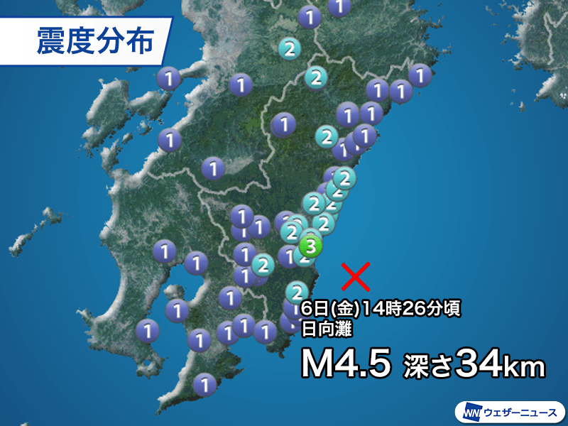 国内:日向灘の地震で震度3以上は今年11回目