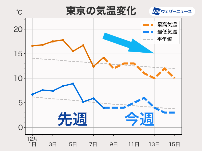 12月の東京の気温を振り返ると先週は気温が高めで15℃を上回る日もありました。ただ、この週末は上空の強い寒気が日本の上空に南下して真冬らしい寒さとなっています。