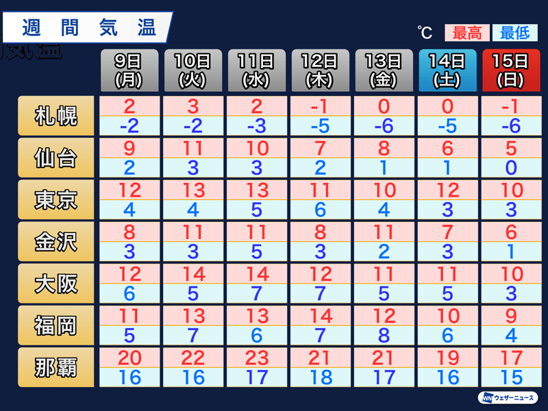 週明けの明日9日(月)以降も上空の寒気が居座って寒さが続く予想です。東京の予想最高気温は15℃を超える日はなく、13日(金)や15日(日)のように10℃に留まるような日もあります。