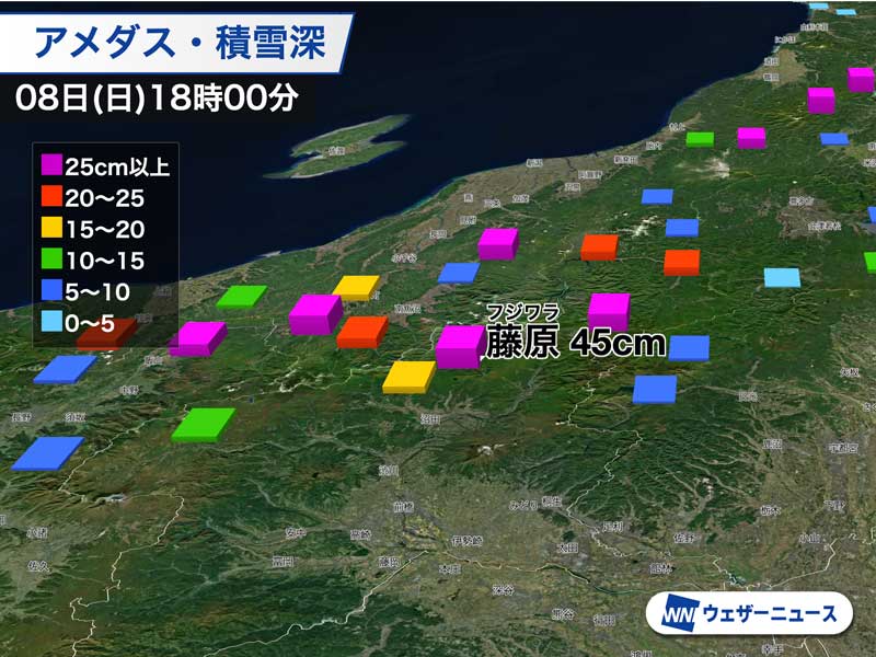 新潟県との県境に位置する群馬県利根郡みなかみ町では朝から断続的に雪が降り積雪が急増しています。藤原のアメダスでは朝7時の時点では0cmだった積雪深が18時の段階で45cmに達しました。