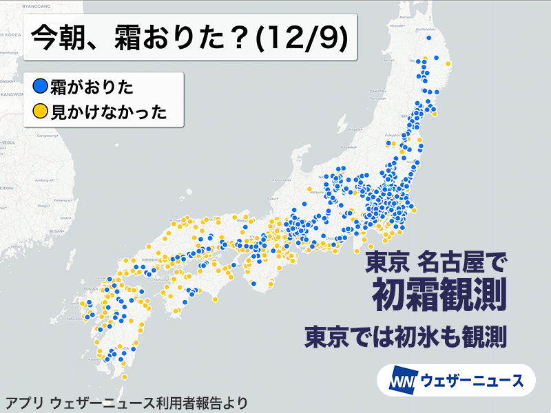 ウェザーニュースがアプリ利用者に今朝、霜が降りていたか?を聞いたところ、関東や東海の平野部でも沿岸の一部を除いて霜がおりていたという報告がありました。西日本では見かけなかったという報告が多くなっています。