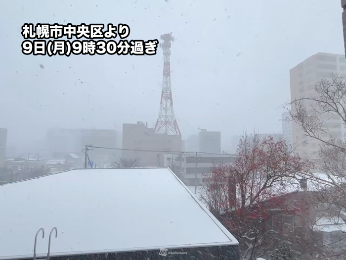 昨夜、日付が変わってから新潟県津南町や北海道上川地方の音威子府村では3時間に7cm、北海道旭川市などでは6cmの降雪を観測しました。札幌市でも雪となり、9時までの1時間で1cm積雪が増えて7cmの雪が積もっています。
