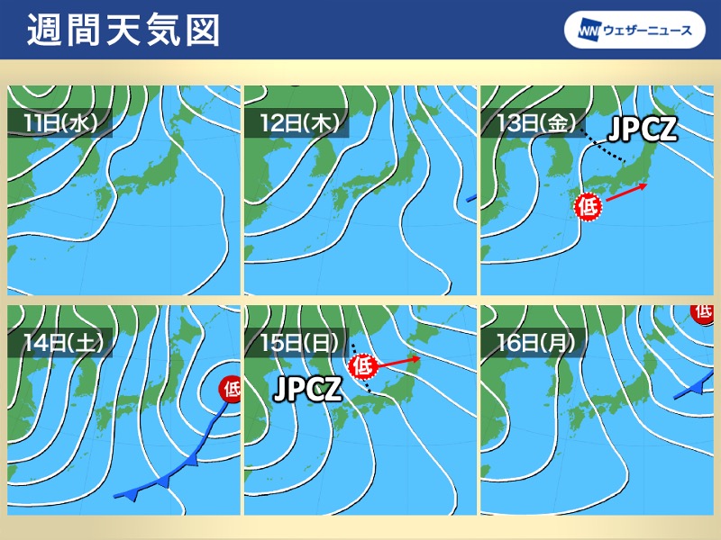 13日(金)から14日(土)にかけてJPCZ上に発生した低気圧が日本海を東に進み、本州を通過します。本州南岸にも別の低気圧が発生して通過し、全国的に荒れた天気となるおそれがあります。本州南岸を通過する低気圧の動向はまだ不確実ですが、太平洋側でも広く雨が降り、強まる可能性があります。