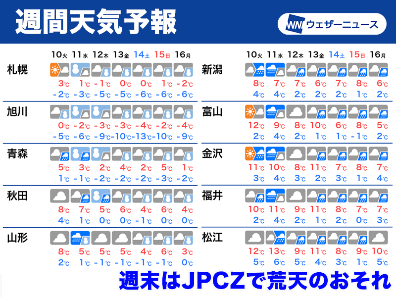 15日(日)から週明けの16日(月)にかけても再び日本海にJPCZが形成されます。JPCZ上に低気圧が発生して東北付近を通過し、その後西高東低の気圧配置になります。