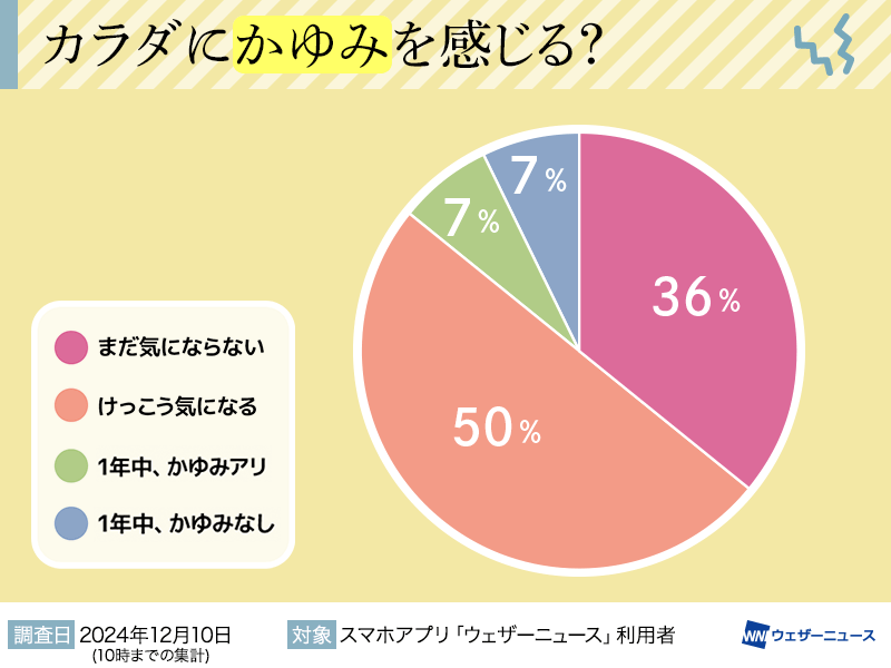 今日12月10日(火)、ウェザーニュースアプリユーザーにカラダのかゆみについて調査を実施。