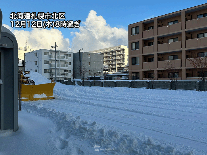 上空5500m付近で−39℃以下の強い寒気に覆われている北海道は、雪雲の発達しやすい状態が続いています。札幌市では昨夜遅くから活発な雪雲がかかり始め、21時から今日3時までの6時間で12cmの新たな雪が積もりました。今は雪雲が離れて青空が見えていますが、8時の時点では積雪18cmです。