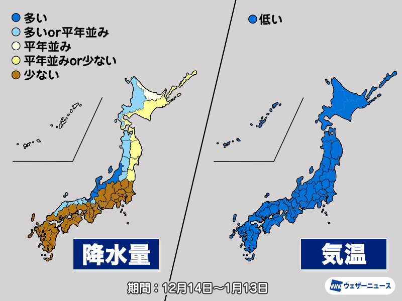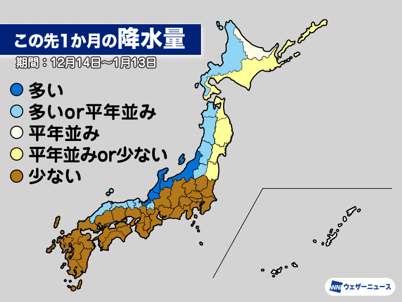 冬型の気圧配置が続くため、1か月の降水量は日本海側で平年並みか平年より多く、太平洋側では平年並みか平年より少ない予想となっています。この時期はもともと日本海側で降水量が多い時期ですので、それが強調される傾向です。