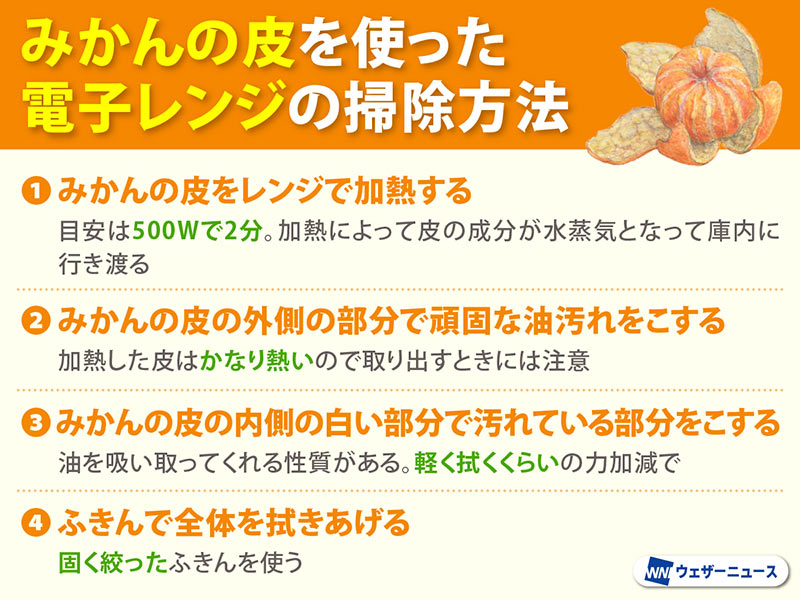 「みかんの皮には、電子レンジのお掃除にぴったりな3つの成分が含まれています。