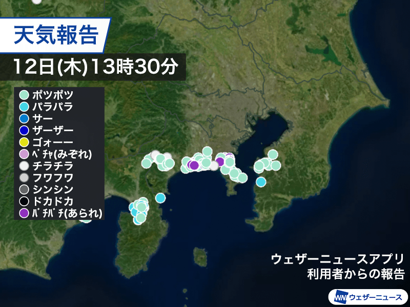 今日12日(木)も冬晴れの所が多い関東ですが、神奈川県や千葉県の一部では昼前から雨や霰(あられ)の降っている所があります。15時前後にかけて降りやすい状況が続く見込みです。
