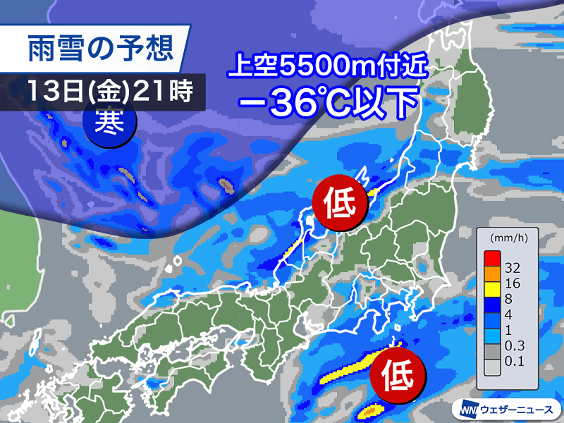 日本海の低気圧は後面に強い寒気を伴っているため、周辺では大気の状態が不安定になります。低気圧に近い北陸を中心に日本海側の各地で雨雲、雪雲が発達して、局地的に強く降る見込みです。