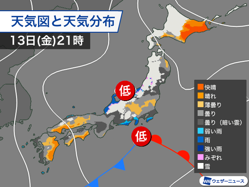 太平洋側の低気圧は夜になると前線を伴って関東の南の海上に達する見込みです。低気圧が陸地から離れた所を進むため雨が降るのは沿岸部や伊豆諸島が中心で、東京都心など関東の大部分や東海、近畿などは曇り空の所が多くなります。