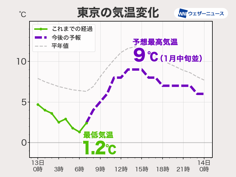 東京 1.2 ℃ 1月中旬並<今季最低>