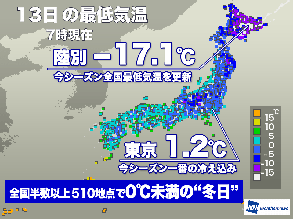 全国的に冷え込んだ朝 北海道は−17℃以下 東京も1℃台と今季最低に