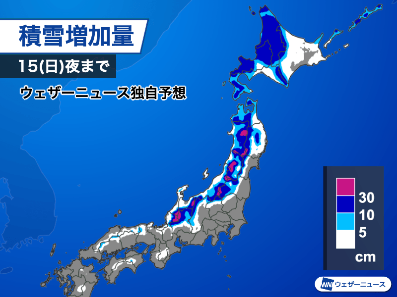 冬型の気圧配置は明日15日(日)も続く見込みで、積雪の増加に注意が必要です。明日夜までの積雪増加量は北海道の広い範囲で10cm以上、東北から北陸山沿いの多い所では30cm以上の予想になっています。西日本も、山沿いでは路面状態の悪化が心配です。峠道の走行は冬用タイヤの装着が欠かせません。