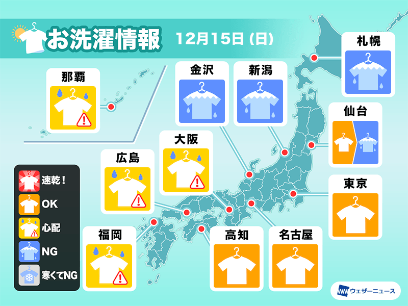 太平洋側は晴れて洗濯日和となります。ただ、沿岸部では風が強まる可能性があるため、洗濯物が飛ばされないようにストッパーなどでしっかりと固定した方が良さそうです。