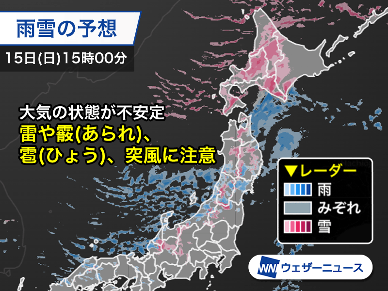 低気圧の接近に伴い、東北や北陸では局地的に雨や雪が強まっています。大気の状態も不安定なため、雷や霰(あられ)が降っている所もある状況です。