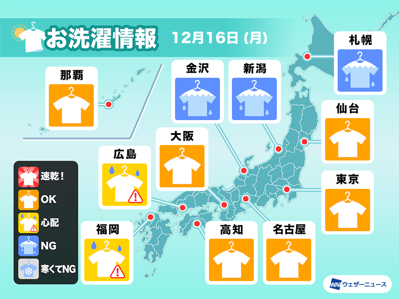 一方、東北や西日本太平洋側、沖縄は雲が広がりやすいものの、外干しは可能です。ただ、乾きにくいため、干し方を工夫すると良さそうです。
