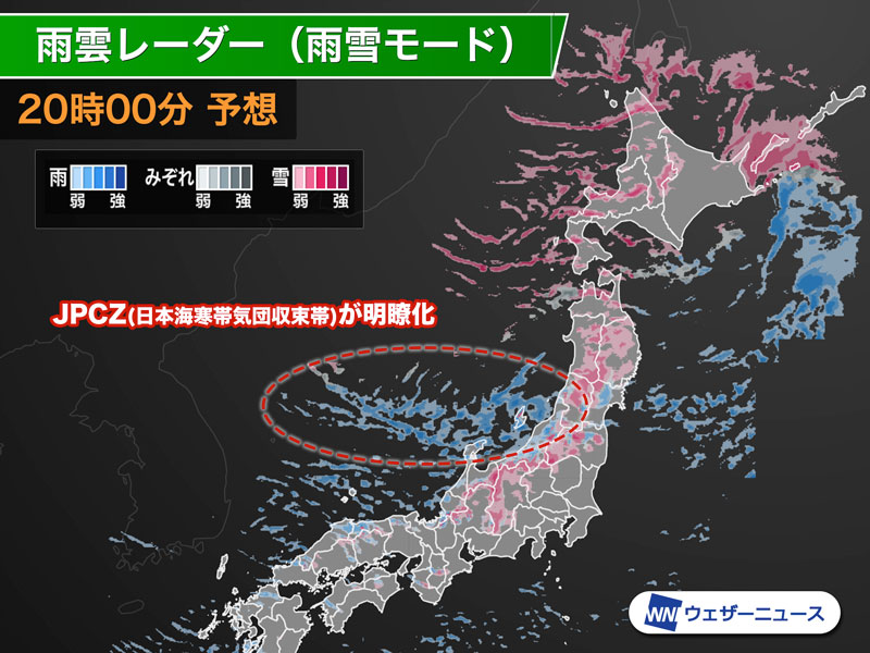 低気圧が東に離れる今夜は冬型の気圧配置になります。上空には寒気が流れ込み、日本海でJPCZ(日本海寒帯気団収束帯)が明瞭化する予想です。