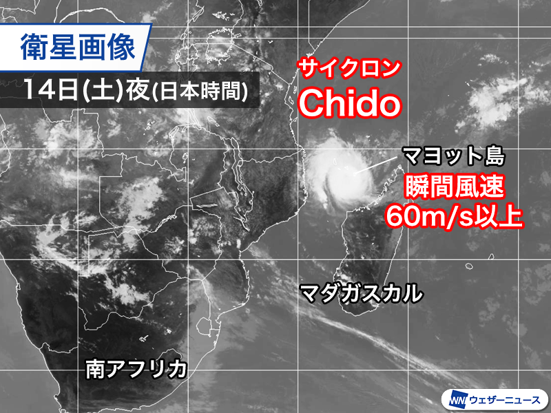 インド洋を西進したサイクロンChidoはマダガスカルの北を通過した後、現地時間の14日(土)にフランス領であるマヨット島付近を通過しました。