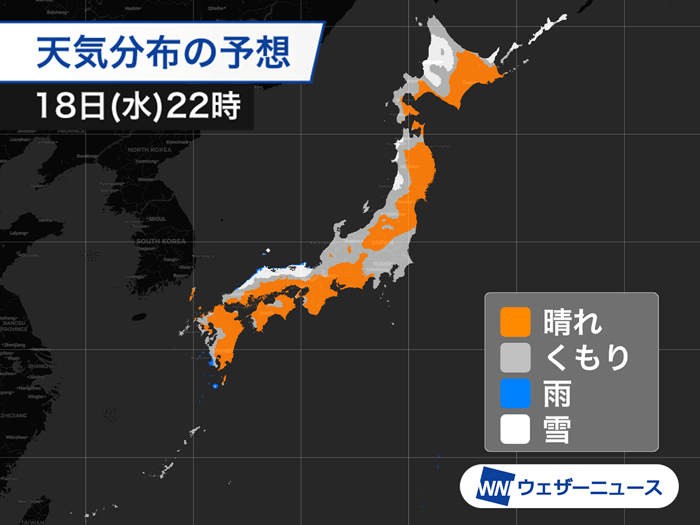 今日18日(水)の日没後は、東海から九州の太平洋側や北日本太平洋側を中心に晴れるところが多い予想で、美しい星空とともに月と火星が接近する様子を楽しめそうです。