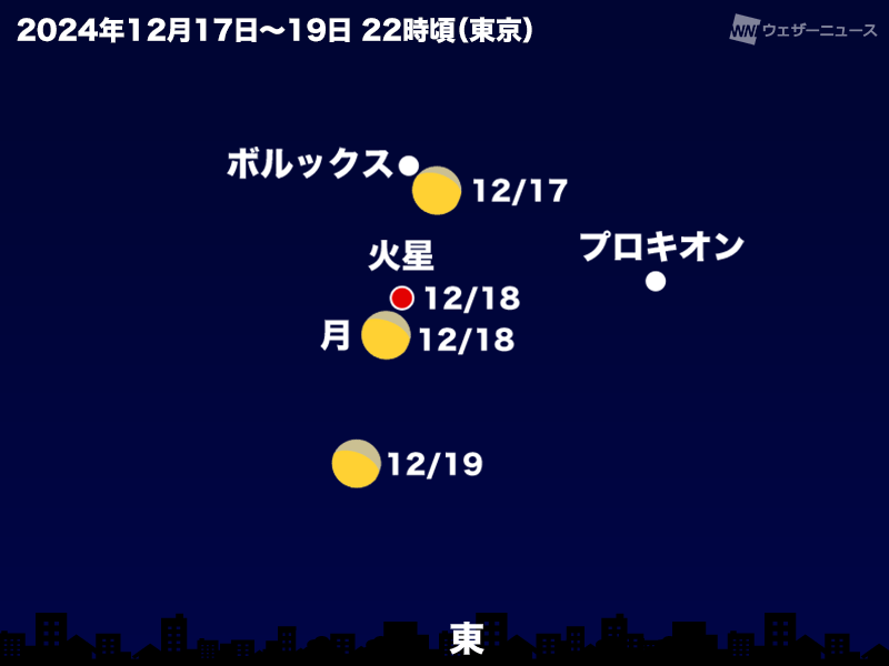 火星の近くには、冬の星座の1等星である「ポルックス」や「プロキオン」の姿もあります。
