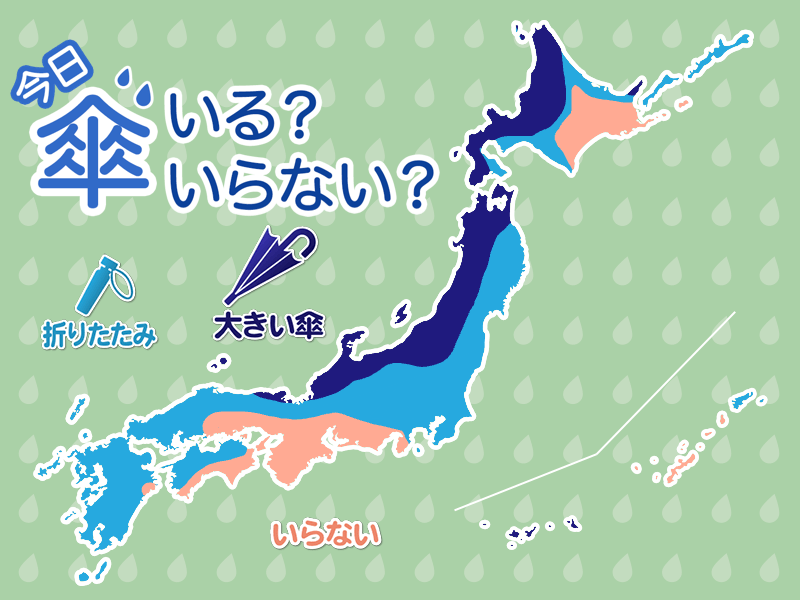 東北太平洋側や中国四国、九州でも雨の降る可能性があります。山陰では夜遅い時間ほど雷や霰(あられ)、突風を伴うおそれがあるため注意が必要です。外出には折りたたみ傘をお持ちください。