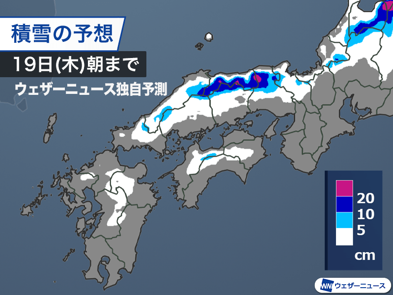 寒気が強いため雨になるのは沿岸部に限られ、内陸部や山沿いの広い範囲で雪になる見通しです。今夜山陰で雪や雨が降り出し、深夜には中国地方の広い範囲、明日19日(木)の未明には九州北部や四国、近畿中南部でも雪や雨の所が増えてきます。
