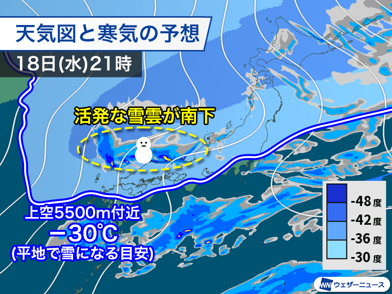 日本列島は冬型の気圧配置が続いています。今夜にかけては強い寒気が日本海を南下し、上空5500m付近で−30℃以下の雪を降らせる目安の寒気が九州北部から四国方面まで覆う予想です。