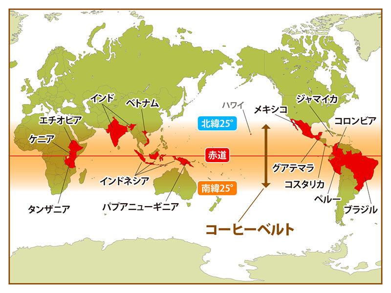 コーヒーは主に、赤道を中心に北緯25°~南緯25°の間に広がる地域で生産されています。これを「コーヒーベルト」といい、ジャマイカ、コロンビア、ブラジル、ベトナム、インドネシア、エチオピア、ケニアなどがこの地帯に入り、これらはコーヒーの生産が盛んな国です。
