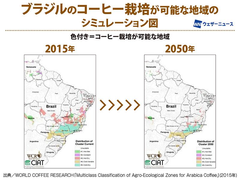 こうした状況はチョコレートの原料であるカカオ豆にもいえます。問題が深刻化する時期も2050年ごろで一致しています。