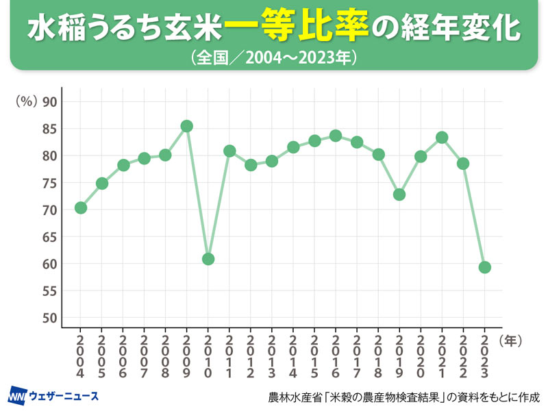 また、農林水産省の一等比率の経年変化の資料をみても、2010年や2023年など記録的な猛暑をもたらした年は一等米比率が著しく低下していることが分かります。