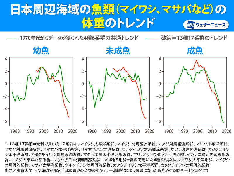 また、日本近海でとれるイワシやサバも、地球温暖化による餌であるプランクトンが減少し、小型化していることが、東京大学大気海洋研究所によって明らかになりました。