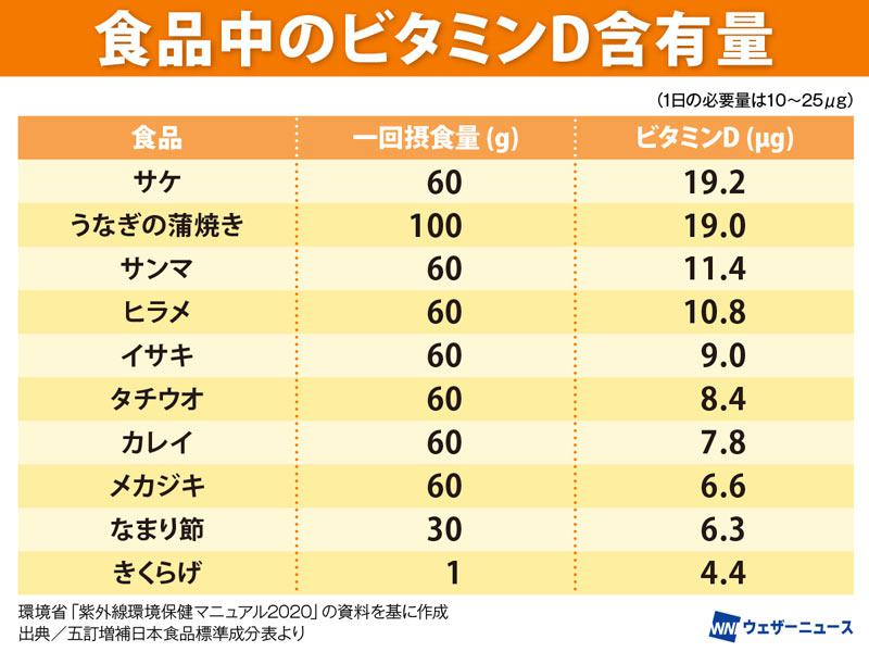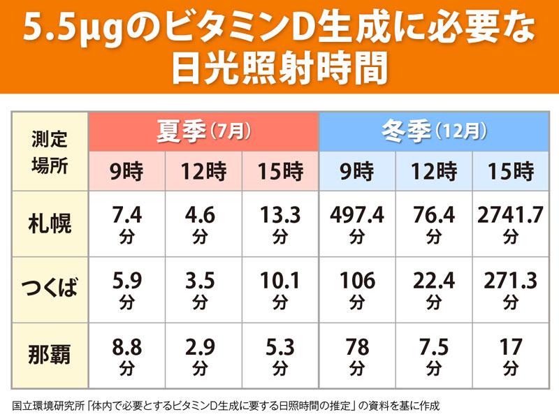 仮に5.5μgのビタミンDを日光浴だけで得ようとすると、晴れた日に顔と両手を露出した状態として、紫外線が弱い12月の正午の場合、東京に比較的気象条件の似た茨城県つくば市で22分24秒、7月の3分30秒の6倍以上の時間が必要という調査結果があります」(山口先生)
