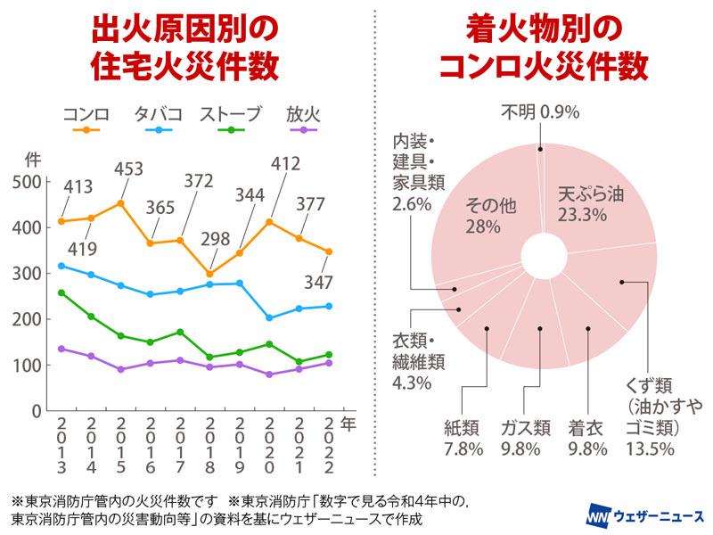 東京消防庁「数字で見る令和4年中の,東京消防庁管内の災害動向等」、同「STOP!住宅防火シリーズ④ 火災から大切な命を守ろう」、総務省消防庁「たしかめくんとボウサイちゃんのこんろ火災防止大作戦!」