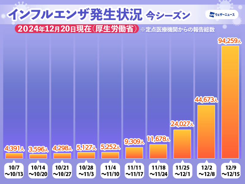 また、東京都は都内のインフルエンザ定点医療機関からの患者報告数が17.36人となり、都の注意報基準を超えたと19日に発表しました。