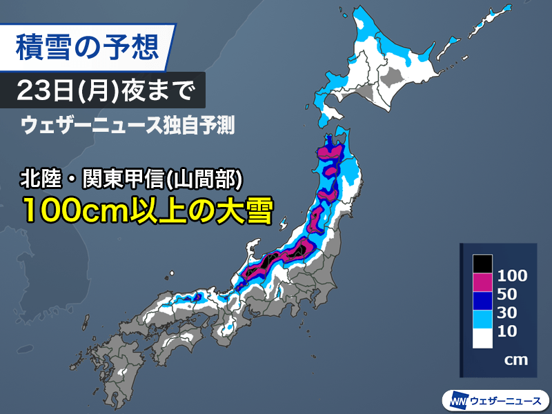 23日(月)夜までの積雪増加量は北陸から関東甲信の山沿いが最も多く、標高の高い山間部ではわずか2日ほどで100cm以上に達する予想です。