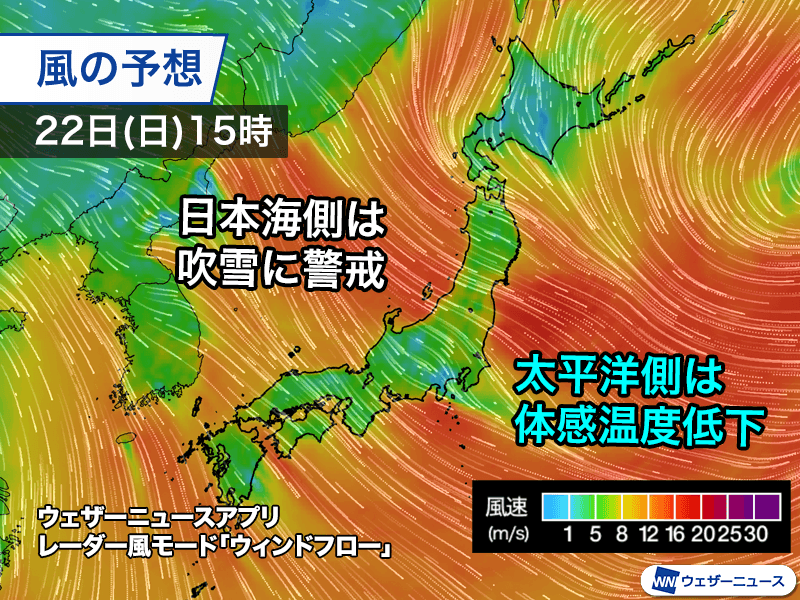 低気圧が東の海上で発達する一方で、大陸からの高気圧の勢力も強いため、東西の気圧差が大きくなります。全国的に北西の風が強まり、瞬間的には25m/sを超える所がある見込みです。