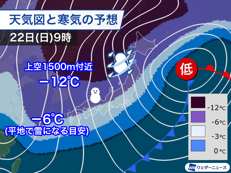 降水があれば平地で雪になる目安の上空1500m付近で−6℃以下の寒気は22日(日)の朝に九州や瀬戸内海付近まで南下し、23日(月)の朝には関東の南まで南下する予想となっています。
