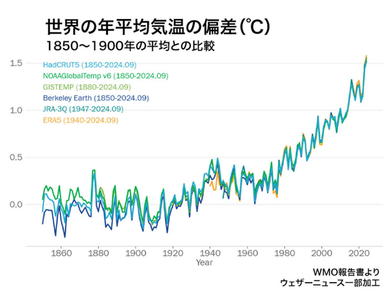 WMO世界気象機関は先月、2024年9月までの地球の平均気温は産業革命以前の1850〜1900年の基準に比べ1.54℃(誤差±0.13℃)高かったと発表しました。これはパリ協定の努力目標である1.5℃を上回る水準です。